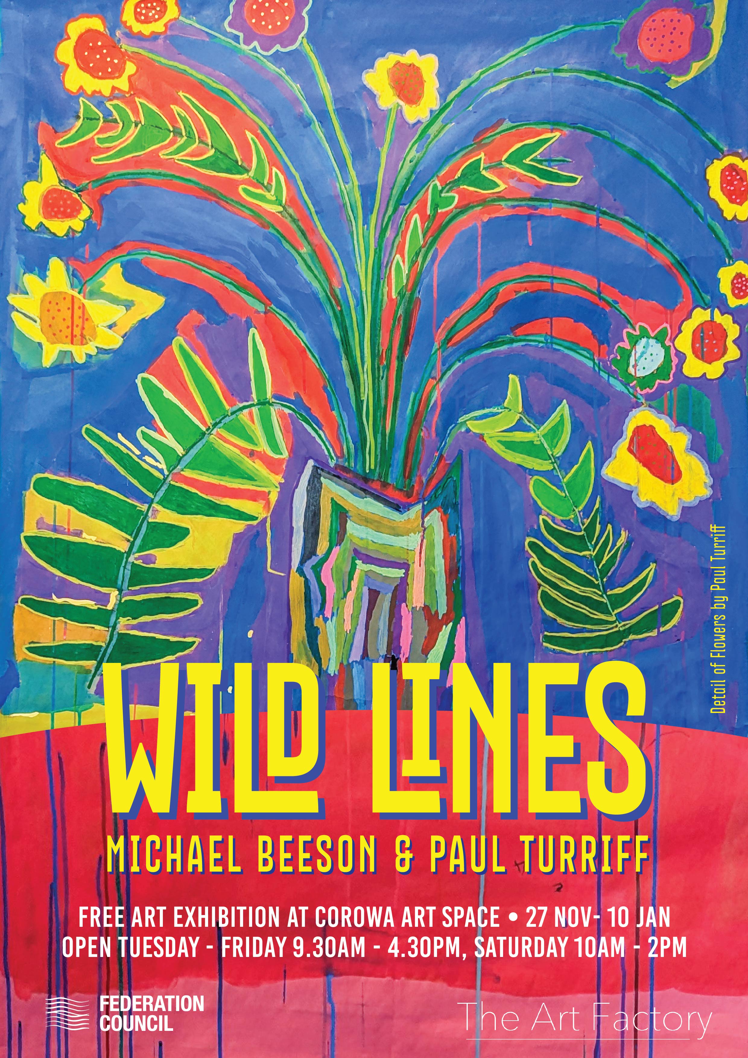 The Corowa Art Space is proud to host its third annual exhibition from The Art Factory studio, ‘Wild Lines: Michael Beeson & Paul Turriff’.