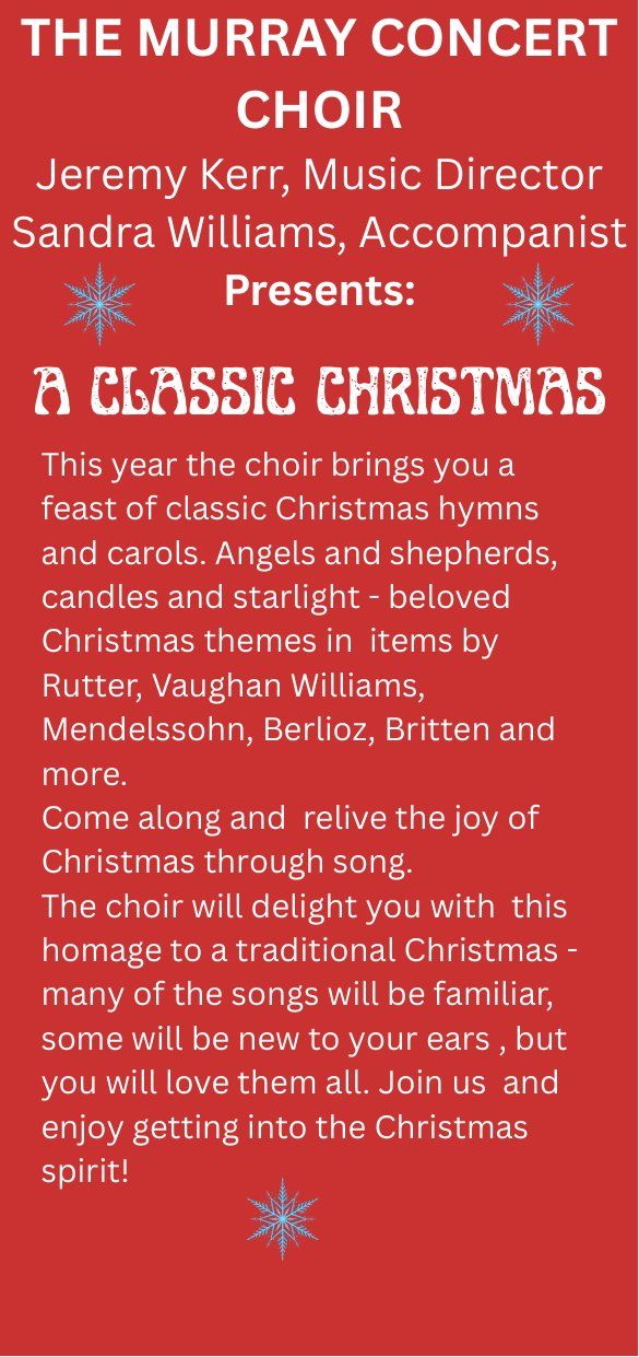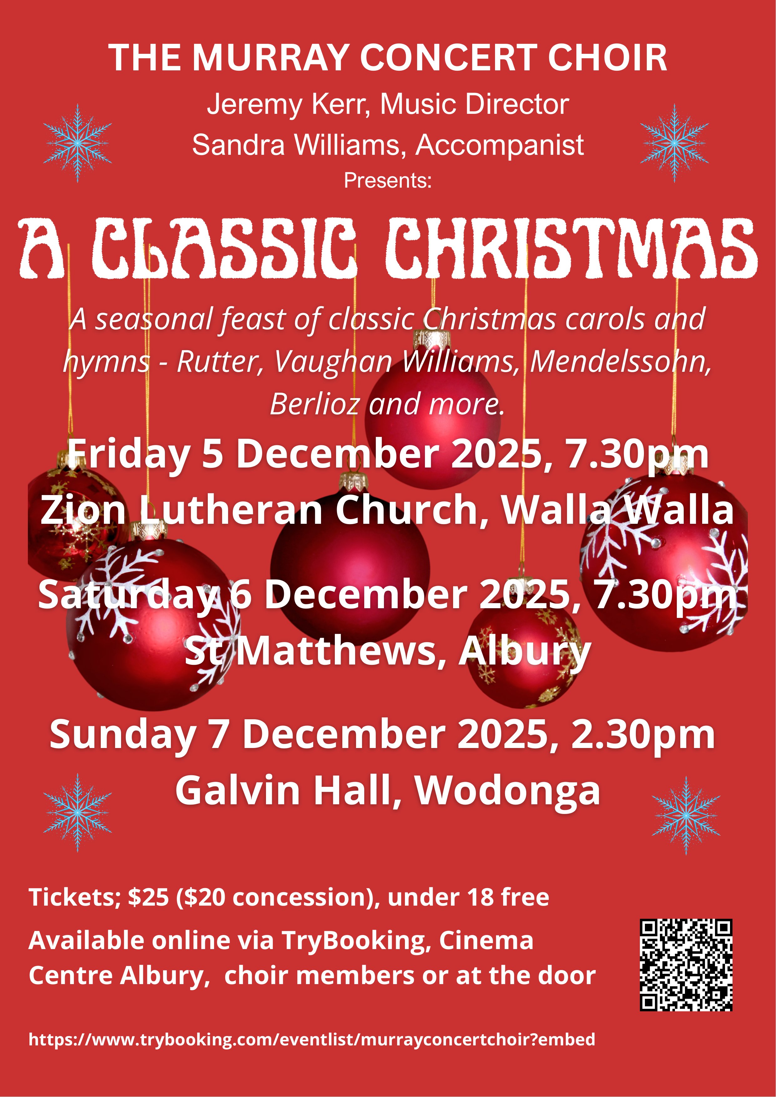 This Christmas, the Murray Concert Choir is presenting a feast of classical Christmas hymns and carols in their concert – “A Classic Christmas” under the direction of the very talented Jeremy Kerr. Tickets are available now via TryBooking using the QR code in the poster attached below, or they will be available at the door….