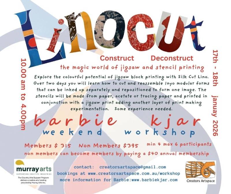Enjoy a New Year print making workshop with Barbie Kjar. Explore the colourful potential of jigsaw block printing using Silk Cut Lino. Cut and reassemble Inyo modular forms that can be inked up separately and repositioned to form one image, as a jigsaw.Then with stencils cut from paper, acetate or tracing paper these will be…