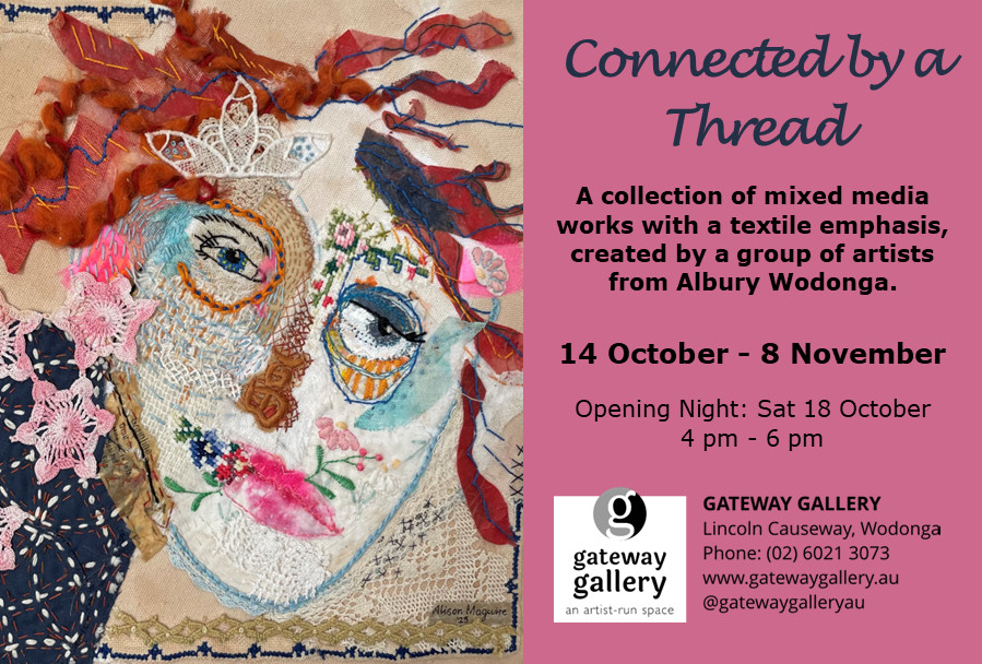 CONNECTED BY A THREAD brings together textile artists from across the Albury-Wodonga region who share a passion for working with fibre and fabric. Meeting monthly, the group provides a supportive space to exchange ideas, learn new techniques, and encourage one another’s creative practice.