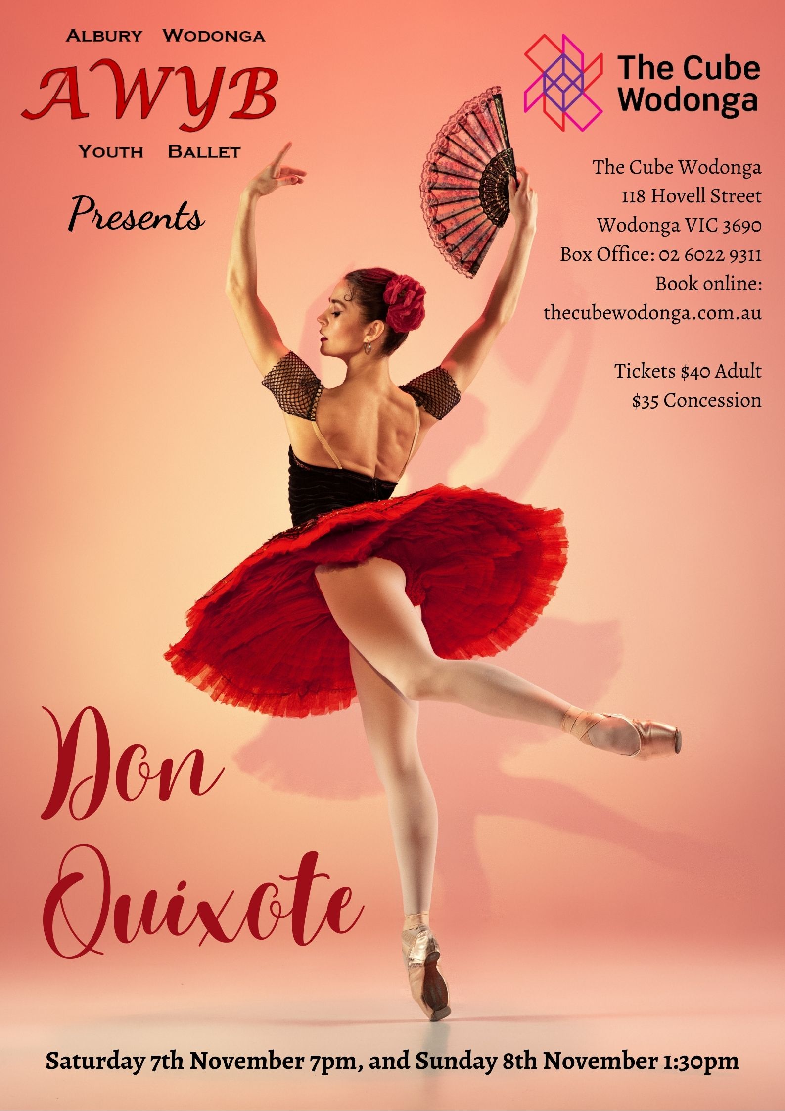 Albury Wodonga Youth Ballet is proud to bring one of ballet’s most loved romantic comedies to the Cube stage! Based on the classic story by Miguel de Cervantes – widely considered the first modern novel ever written – the ballet follows the titular Don Quixote as he sets off on a quest to find his…