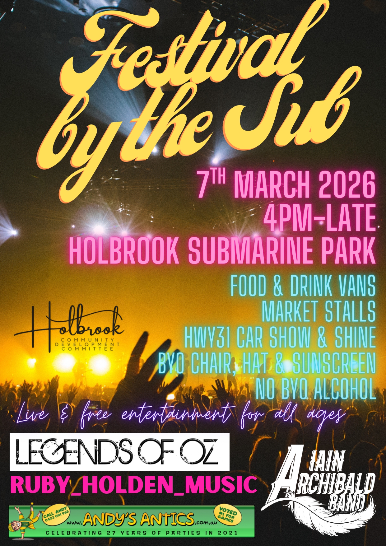 Live music. Open air. A crowd that knows how to enjoy a Saturday night. Holbrook Festival by the Sub always brings the vibe – and this year will be no different. We are super excited to announce Legends of OZ, Iain Archibald Band, Ruby Holden Music and a little something for the kids with Andy’s…