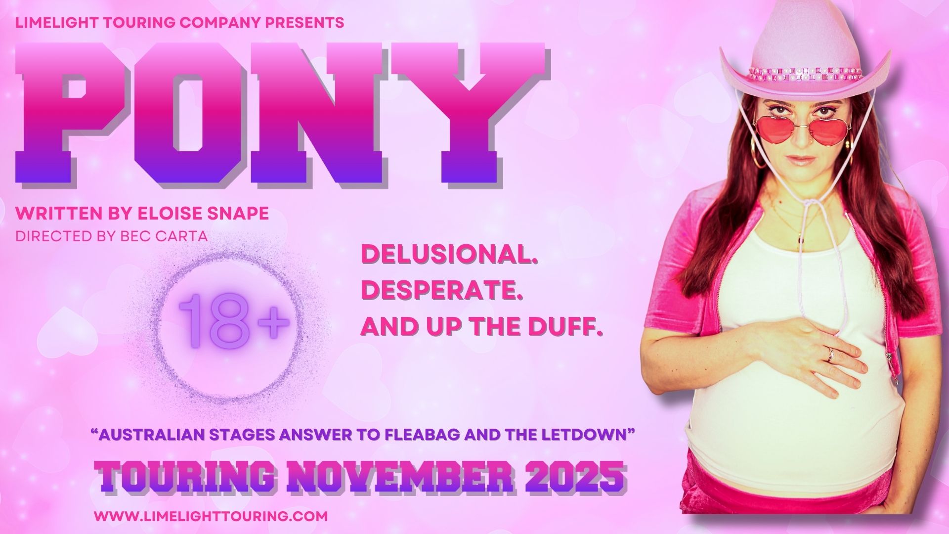 Pony. Written by Eloise Snape, proudly presented by Limelight Touring Company. Delusional, desperate and up the duff. Get ready for a wild ride! Meet Hazel – a 37 year old woman (and 27 other characters along the way!), as she navigates her journey through ultrasounds to baby showers – all while ignoring the chaos that…