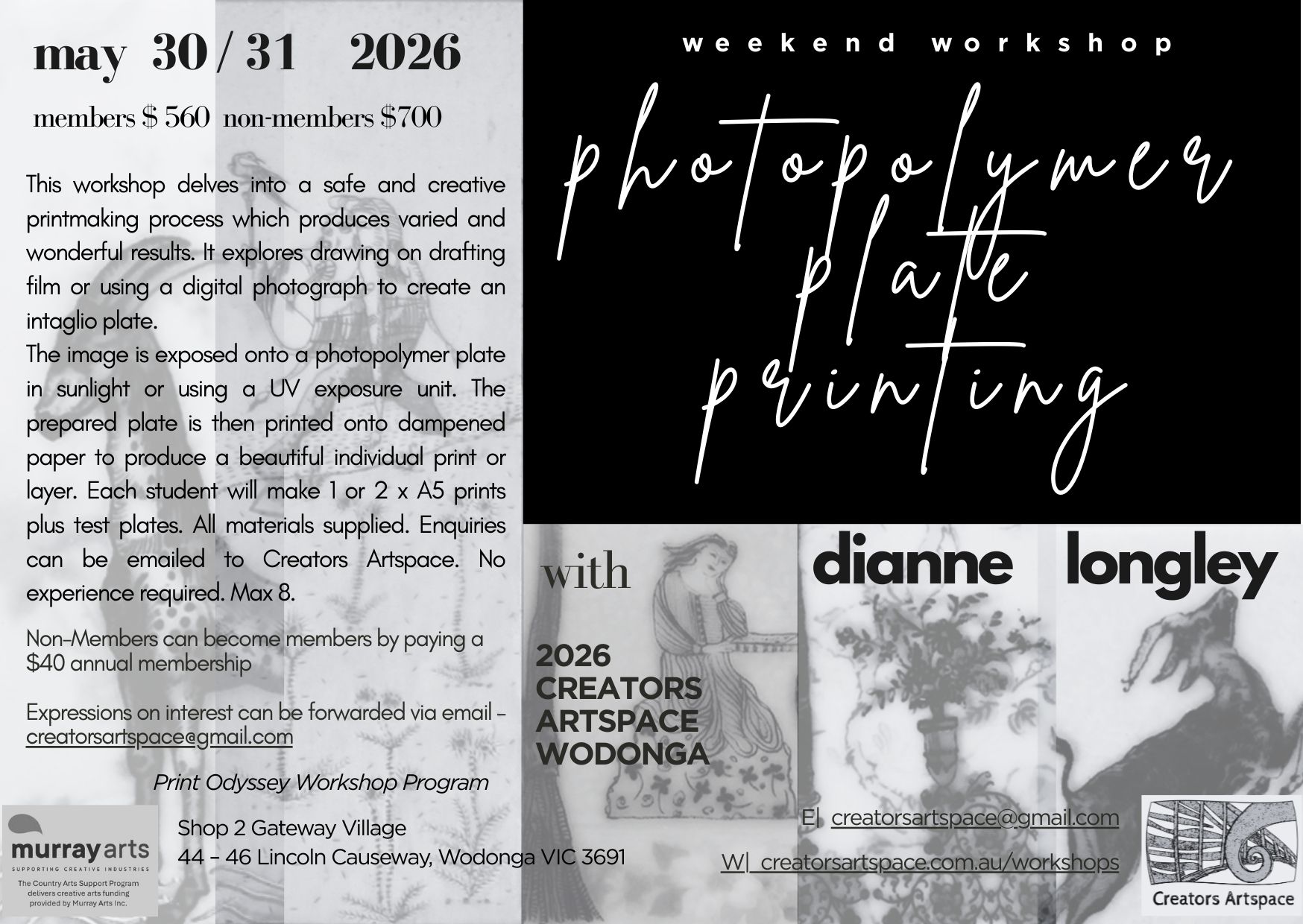 Discover the world of photopolymer plate printing. Dianne brings a wealth of experience to this weekend workshop. She has a recognised expertise in this area of print making. You can choose to make a drawing on drafting film to create an intaglio photopolymer plate/print or you can use a digital photograph to create a print….