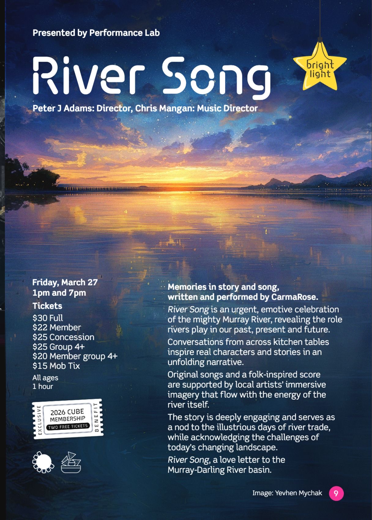 Memories in Story and Song Written and performed by CarmaRose Riversong is an urgent, emotive celebration of the mighty River Murray, revealing the role rivers play in our lives – past, present and future. Conversations from across kitchen tables inspire real characters and stories in an unfolding narrative. Stories of historic pioneering adversity, drawn from first-hand reportage reveal the spirit of rural Australia in an historical and contemporary lense. The original songs and folk-inspired score, supported by local artists’ immersive imagery, flow with the energy of the River itself. The spirit of country Australia, with Riversong touring traditional Halls and Venues, is a journey of humour, heartbreak, and courage. The story is deeply engaging and serves as a nod to the illustrious days of river trade, while acknowledging the challenges of today’s changing landscape. Riversong, a love letter to the Murray-Darling River. A warm and heartfelt journey… the interdependence of nature and humankind. Peter J Adams : Director Chris Mangan: Music Director