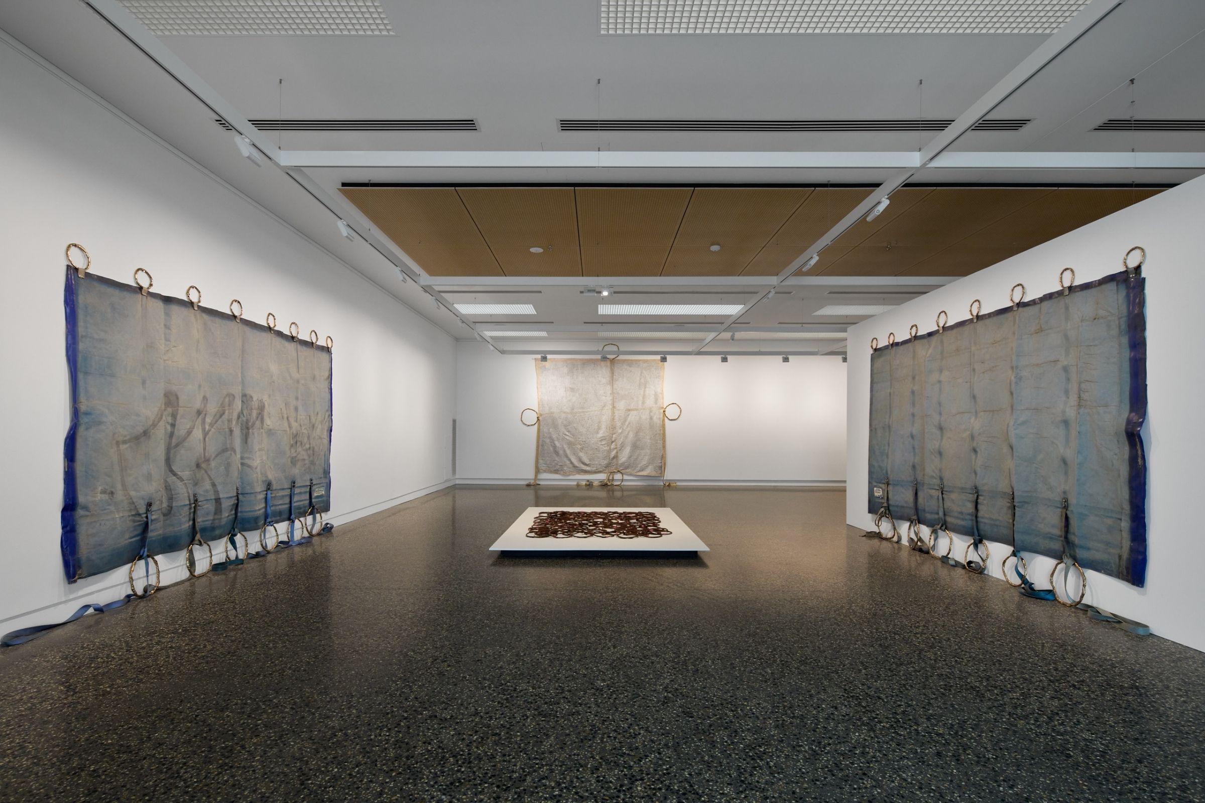 Dense embroidery, delicate chainmail, and found truck curtains come together in Teelah George’s Fragile Armour in a way that both reinforces and extends the material interests that drive her practice. Embroidery is an established and important part of George’s output, represented in Fragile Armour with Wall piece, a large textile composed of thousands of hand embroidered stitches, evidence of the labour and time expended on its making, which combine to create a compellingly beautiful work. Wall piece has been exhibited, reimagined, and reconfigured since 2018, a process that furthers considerations of time’s effects on a work of art, beyond the hours consumed by its initial creation.
