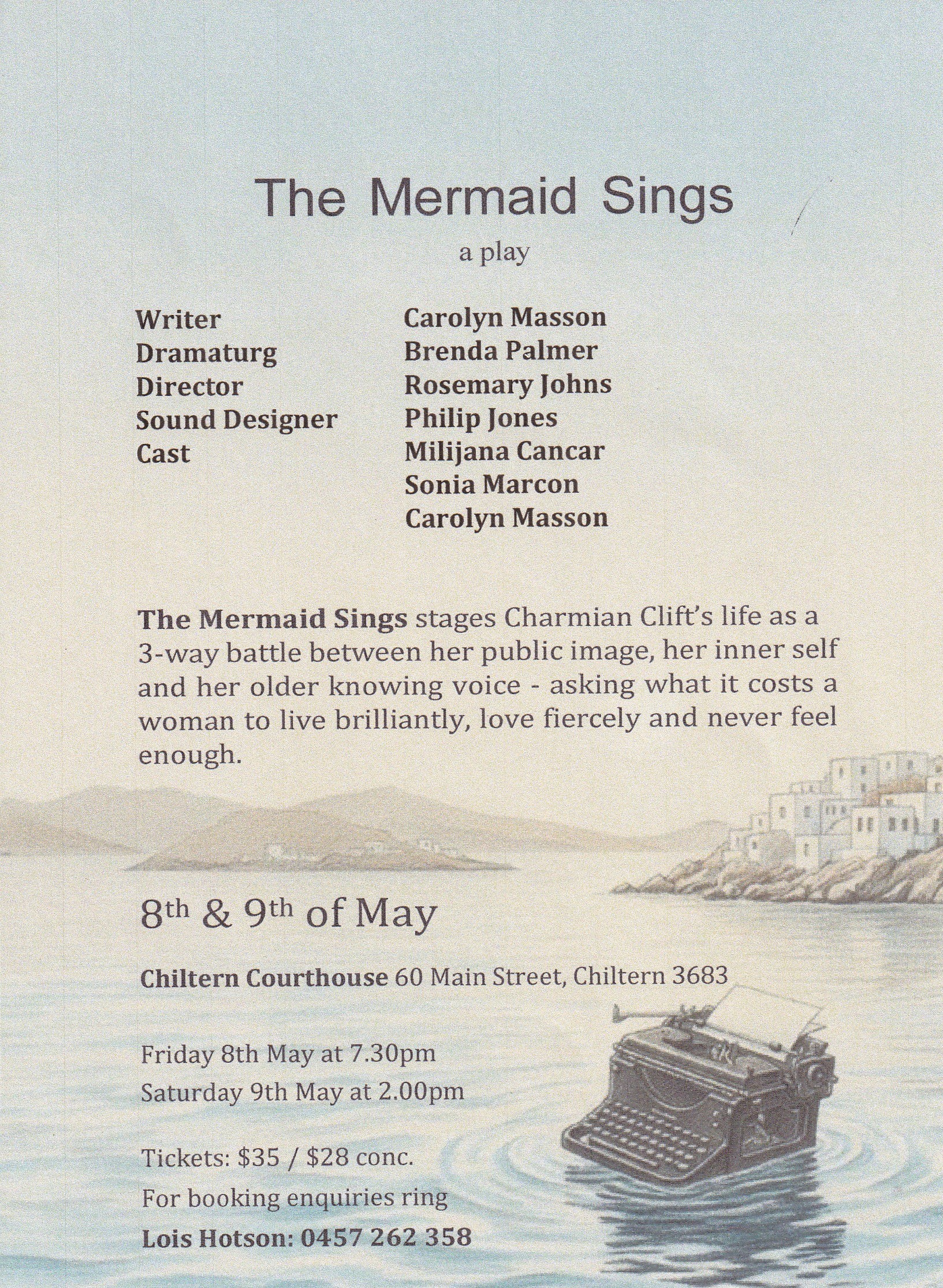 The Chiltern Courthouse together with the New Performance Company are pleased to present a Play… “THE MERMAID SINGS” Stages Charmian Clift’s life as a 3 way battle between her public image, her inner self and her older knowing voice – asking what it costs a woman to live brilliantly, love fiercely and never feel enough….