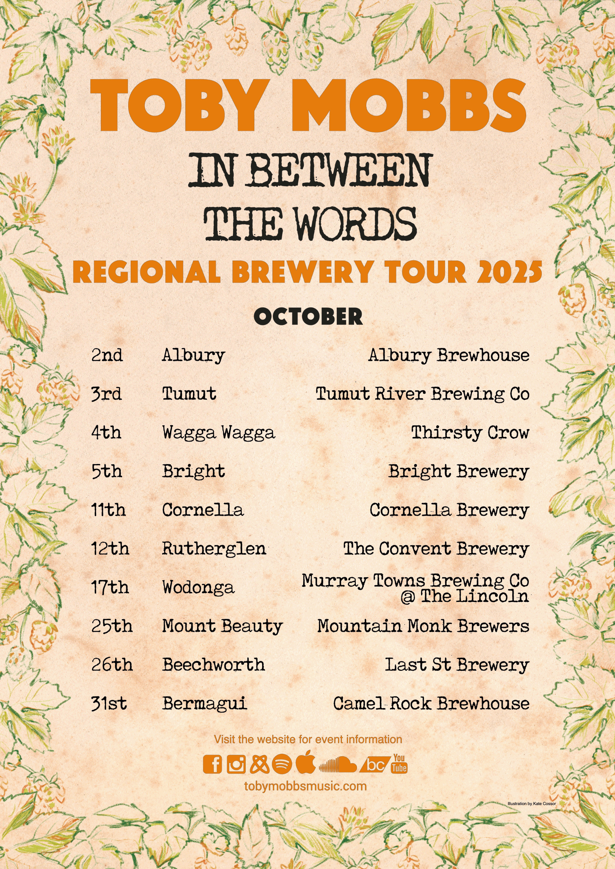 Free event – Bookings recommended Following up from last year’s National Tour, Toby Mobbs will be keeping things closer to home for a 10-show run of the region’s best breweries. Toby will be showcasing stripped back versions of his second album ‘In Between The Words’. Albury – Albury Brewhouse – 2nd October 6pm Tumut –…